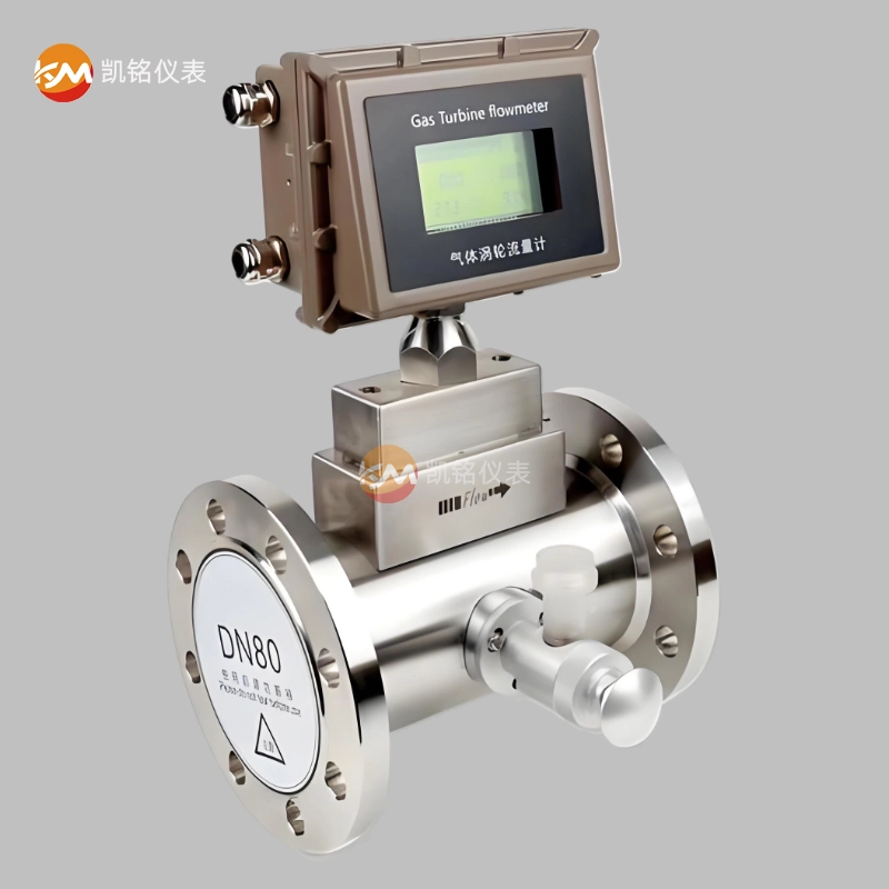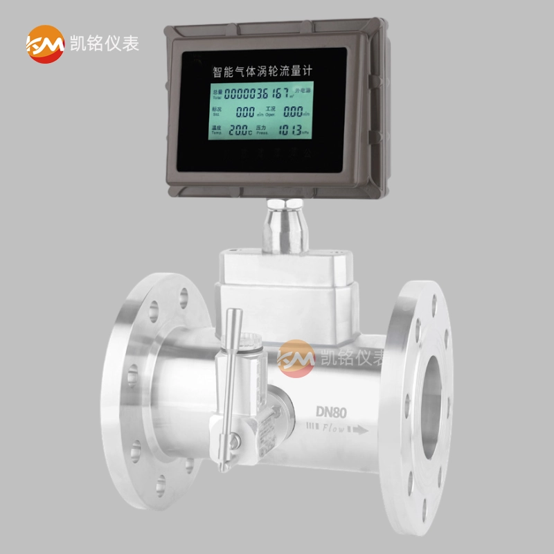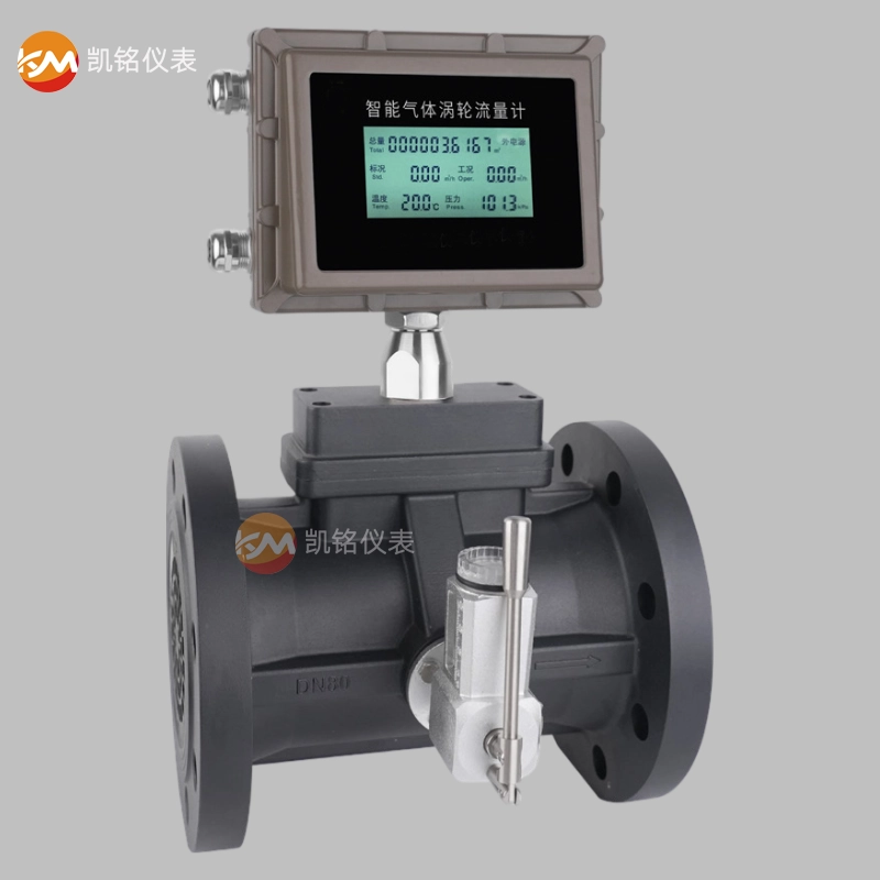 当流体流入流量计时,在进气口专用一体化整流器的作用下得到整流并加速,由于涡轮叶片与流体流向成一定角度,此时涡轮产生转动力矩,在克服摩擦力矩和流体阻力矩后,涡轮开始旋转。在一定的流量范围内,涡轮旋转的角速度与流体体积流量成正比。根据电磁感应原理,利用磁敏传感器从同轴转动的信号轮上感应出与流体体积流量成正比的脉冲信号,该信号经放大、滤波、整形后与温度、压力传感器信号一起进入智能流量积算仪的微处理单元进行运算处理,并把气体的体积流量和总量直接显示于LCD屏上。