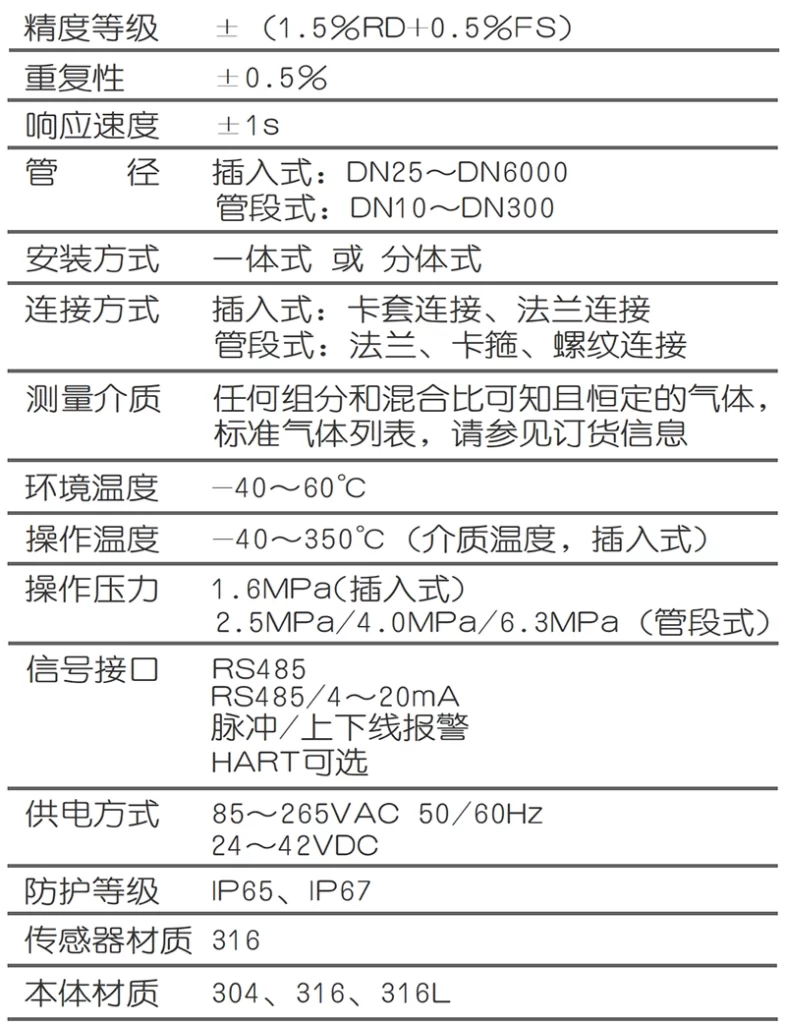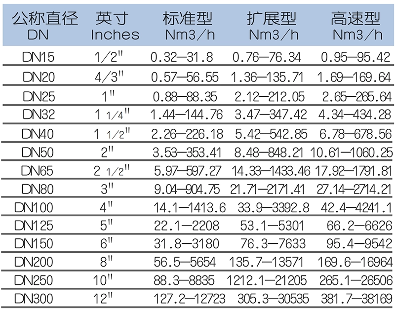标准型、扩展型、高速型对应的流速范围分别为:0.5~50Nm/s、1.2~120Nm/s、1.5~150Nm/s,所提到的流速单位Nm/s是指温度为20°C、压力为0.1MPa条件下的标准流速。