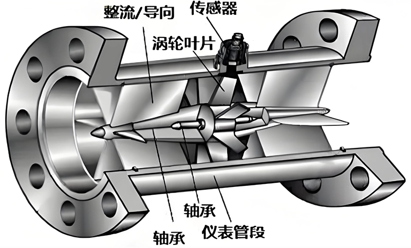 当被测液体流过传感器时,在流体作用下,叶轮受力旋转,其转速与管道平均流速成正比。叶轮的转动周期地改变磁回路的磁阻值,检测线圈中的磁通随之发生周期性变化,产生频率与叶片旋转频率相同的感应电动势,经放大后,进行转换和处理。